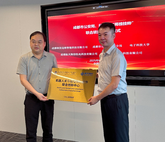 勇者先,能者上。7月3日,成都市公安局、成都市经济和信息化局“揭榜挂帅”联合项目组签约仪式在成都举行。成都航天凯特机电科技有限公司与成都市锦发边缘智能科技有限公司等单位组成联合体,共同承接警用四足智能巡防机器狗的研发,其中我司主要负责关节驱动系统的研发工作,以满足成都市公安局锦江区分局的治安巡逻防控对智能化装备的应用需求,助力锦江区智能化安全防线的构建。